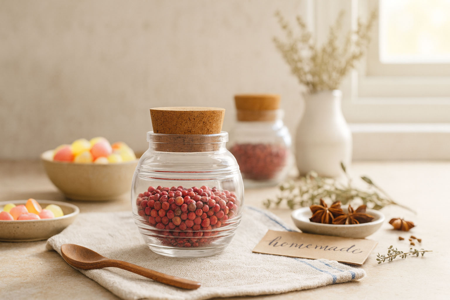 A „Jule” sorozat esztétikus eleganciát ötvöz a praktikus funkcionalitással, és stílusos megoldást kínál fűszerek, cukorkák és egyéb finomságok tárolására. A gömb alakú parafadugós üveg lágyan lekerekített formájával és jellegzetes csíkozott domborulatával tűnik ki, amely különleges tapintást és nosztalgikus bájt kölcsönöz neki. A kerek alap harmonikus megjelenést biztosít, míg a parafadugós nyakzat biztonságos és természetes zárást tesz lehetővé. A Jule nem csupán egy praktikus tárolóüveg, hanem dekoratív különlegesség is, amely minden konyhában vagy asztalon hangsúlyt kap.